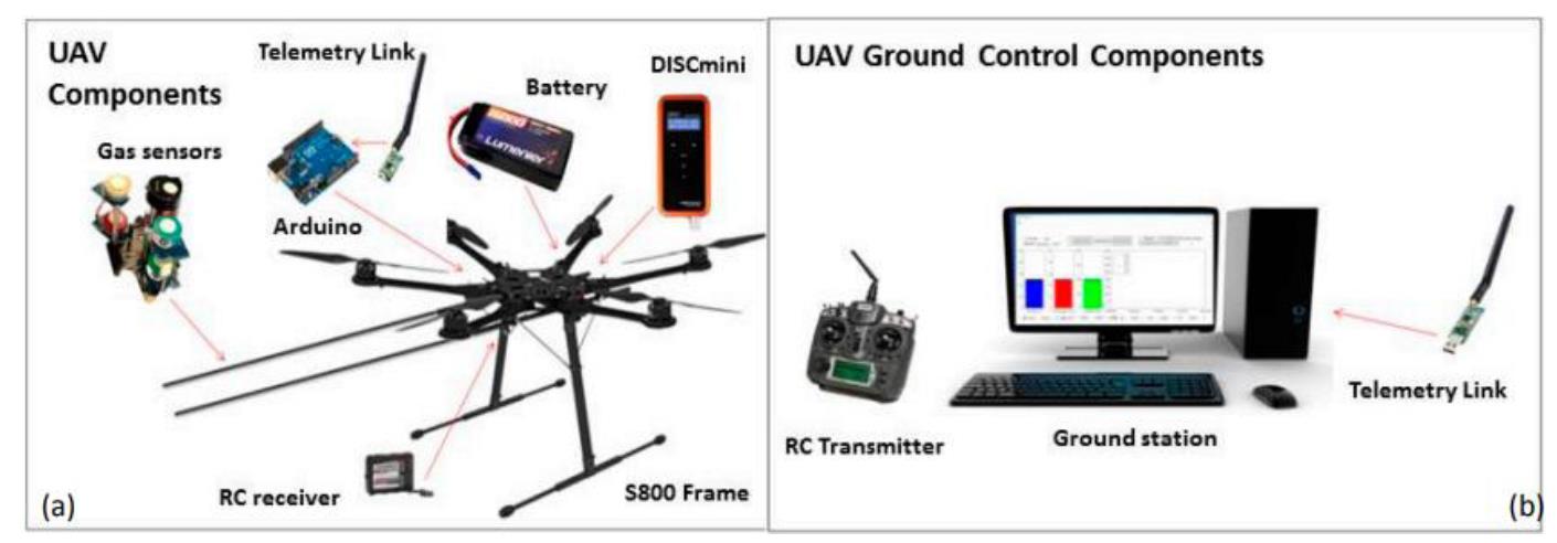 System opracowany przez Villa i zespół w ramach powyższych badań składa się z sześcioramiennego drona (S800 EVO wyprodukowany przez DJI, Shenzhen, Chiny) z czterema czujnikami gazów: CO, CO2, NO i NO2. Wyposażony jest również w czujniki temperatury i wilgotności, a także interfejs wizualizacji w czasie rzeczywistym. Wszystkie czujniki były zintegrowane z płytą mikrokontrolera Arduino MEGA 2560. Rysunek 1. przedstawia system pomiarowy.