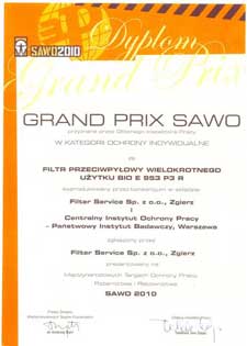 GRAND PRIX SAWO 2010 przyznane przez Głównego Inspektora Pracy w kategorii ochrony indywidualne za Filtr przeciwpyłowy wielokrotnego użytku BIO E 953 P3 R