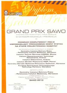 GRAND PRIX SAWO 2010 przyznane przez Ministra Pracy i Polityki Społecznej w kategorii edukacja i prewencja za Program komputerowy PRO-M wspomagający prowadzenie oceny ryzyka na etapie projektowania maszyny