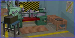 Komputerowe obiekty pierwszego planu to obiekty środowiska pracy znajdujące się w strefie pracy użytkownika, takie jak tokarka TUK-40 oraz wyposażenie tego stanowiska pracy, tj.: skrzynie z półproduktami i odpadami, parawan, klucz trzpieniowy, podest drewniany itp. Obiekty te wykonano w sposób realistyczny z uwzględnieniem kolorystyki oraz odpowiedniej wielkości, tak aby ich obraz był jak najbardziej zbliżony do wyglądu ich odpowiedników w rzeczywistym środowisku pracy (Fot. 1.)