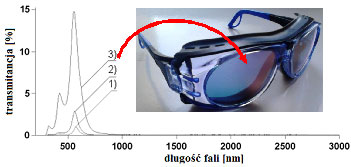 Opracowany w ramach tematu interferencyjny filtr ochronny składa się z podłoża oraz powłoki wykonanej z warstw metalicznych i materiałów (warstwy absorpcyjne) oraz dielektrycznych. Zasada działania powłoki filtra jest oparta na interferencyjnym wymuszeniu podwyższonej transmisji w cienkiej warstwie metalicznej w określonym przedziale spektralnym. W metalicznych warstwach absorpcyjnych można doprowadzić do podwyższenia współczynników przepuszczania w wybranym paśmie spektralnym przez naniesienie odpowiednio dobranej interferencyjnej struktury złożonej z warstw dielektrycznych. Opracowany filtr ochronny może być wykonany z podłoża mineralnego (szkła) lub organicznego (poliwęglanu). Na tym podłożu naniesionych jest siedem warstw wykonanych z materiałów: dielektrycznych o wysokim i niskim współczynniku załamania (5 warstw) oraz metalicznych (2 warstwy). Kolejność, liczba i grubości optyczne warstw dielektrycznych są niezależne od typu podłoża i stosowanej technologii naparowania. Dla uzyskania żądanego stopnia ochrony zmienia się grubość warstw metalicznych. Filtry można montować w oprawy okularów ochronnych lub osłon twarzy. Na rys. 1 przedstawiono przykładowe charakterystyki spektralne opracowanych filtrów dla najczęściej stosowanych stopni ochrony: 4-3, 4-5, 4-7 oraz typowe okulary ochronne wykorzystywane do pracy na stanowiskach gorących z zamontowanymi filtrami interferencyjnymi.