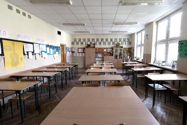 Projekt II.B.04. Widok sali lekcyjnej z zainstalowanym dźwiękochłonnym sufitem podwieszanym