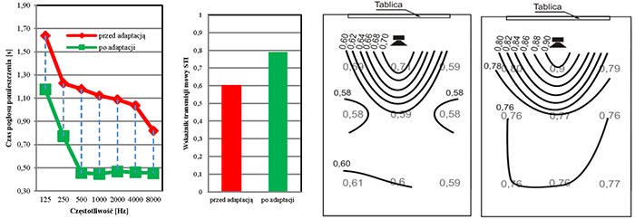Projekt II.B.04. Wyniki pomiarów (od lewej): średnie w sali lekcyjnej wartości czasu pogłosu, średnie w sali lekcyjnej wartości wskaźnika transmisji mowy STI, rozkłady w sali wskaźnika transmisji mowy STI: przed i po wykonaniu adaptacji akustycznej