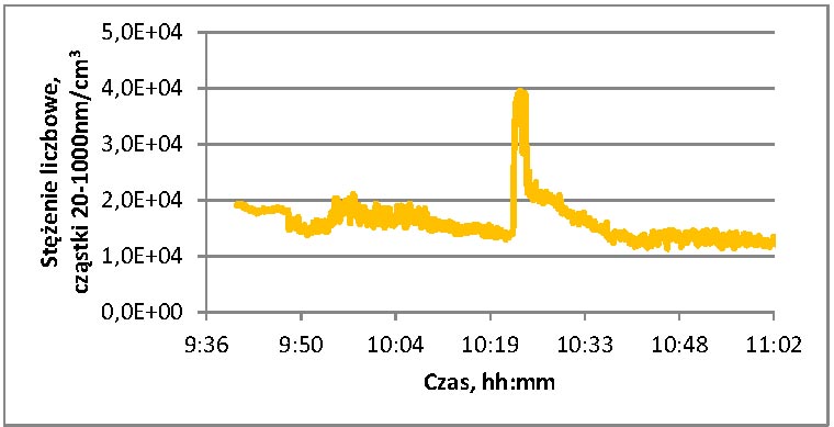Projekt I.B.03. Zmiany stężenia liczbowego cząstek o wymiarach 20 − 1000 nm w powietrzu przed procesem mieszania glinokrzemianu warstwowego Halloysite nanoclay (pomiary P-TRAK) (tło), podczas jego trwania (wartość maksymalna) i po procesie