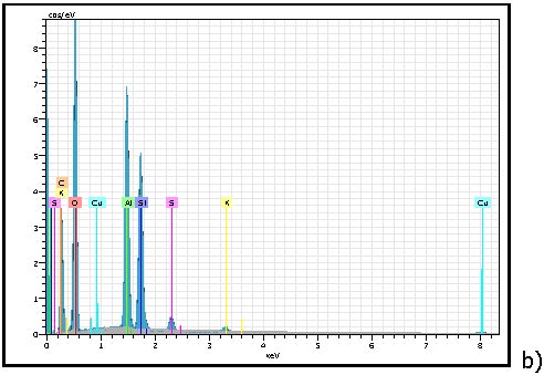 Projekt I.B.03. Zdjęcie mikroskopowe (a) oraz skład chemiczny nanorurek (b) pobranych z powietrza w strefie oddychania pracownika podczas mieszania glinokrzemianu warstwowego (Halloysite nanoclay)