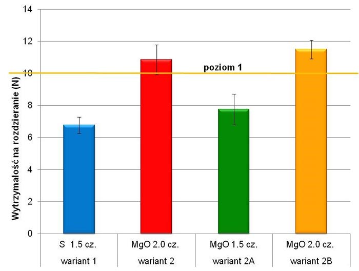 Przeprowadzono weryfikację składu i sposobu otrzymywania nanokompozytu w celu zwiększenia wytrzymałości mechanicznej w zakresie odporności na rozdzieranie. Zgodnie ze zweryfikowaną recepturą wykonano warianty materiałów, zróżnicowane pod względem ilości wytypowanej substancji sieciującej (tlenek magnezu) wprowadzanej do lateksu XNBR (1.5 lub 2.0 cz. wag.). Stwierdzono, że korzystniejsza okazała się większa ilość tlenku magnezu (2.0 cz. wag.), gdyż pozwoliła ona na poprawę odporności powyżej 10 N, i tym samym spełnienie wymagań 1. poziomu skuteczności.