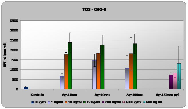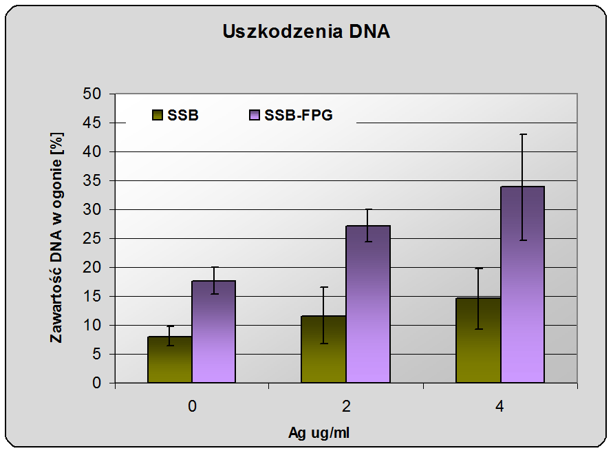 w komórkach zachodziły w stężeniach mniejszych niż cytotoksyczne, przy czym zdolność do produkcji RFT oceniana na podstawie oznaczania poziomu TOS była znacznie większa niż całkowita zdolność antyoksydacyjna (TAS), co może wskazywać na powstawanie stresu oksydacyjnego w komórkach. Wyniki testu kometowego wykazały, że RFT powstające w komórkach pod wpływem nanocząstek srebra mogą powodować oksydacyjne uszkodzenia DNA.