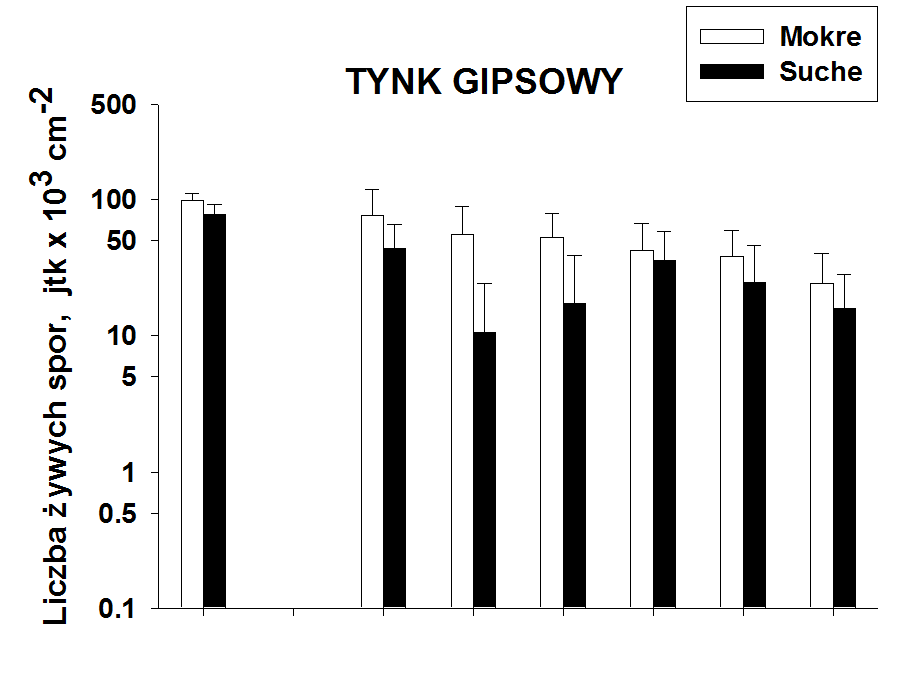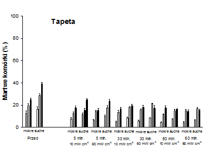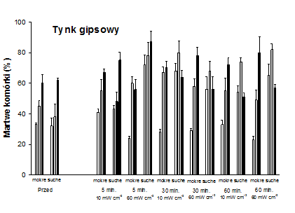 Przed przystąpieniem do zabiegu mikrofalowego oczyszczania trzeba również określić stan uwodnienia spor, np. przez pomiar aktywności wodnej, aw, lub wilgotności względnej powietrza. Jest to warunek konieczny prawidłowego i skutecznego wykonania zabiegu dekontaminacji PM. W przypadku drobnoustrojów należących do tzw. pierwszo- i drugorzędowych kolonizatorów wnętrz (tj. mikroorganizmów kserofilnych o aw < 0,85 i aw = 0,85-90, czyli odpowiednio o małych i średnich wymaganiach wilgotnościowych), najbardziej efektywne parametry PM (czas działania i gęstość mocy), istotnie zmniejszające przeżywalność i cytotoksyczność ich spor, to: dla grzybów Cladosporium cladosporioides i Aspergillus versicolor − 60 min i 60 mW/cm2 (z wyjątkiem cytotoksyczności spor A. versicolor rosnących na cegle, betonie i kamieniu, dla których 30-minutowa ekspozycja oraz gęstość mocy 10 mW/cm2 i 60 mW/cm2 są bardziej efektywne); dla Penicillium brevicompactum − 60 min oraz 10 mW/cm2 i 60mW/cm2 w przypadku przeżywalności oraz 5 min i 30 min oraz 60 mW/cm2 w przypadku cytotoksyczności spor. W odniesieniu do tzw. trzeciorzędowych kolonizatorów wnętrz (tj. hydrofilnych drobnoustrojów o aw > 0,90, czyli dużych wymaganiach wilgotnościowych, np. promieniowców), sytuacja nie jest tak jednoznaczna. Ekspozycja bakterii Streptomyces albus na PM o gęstości mocy 10 mW/cm2 i 60 mW/cm2 trwająca 5 min lub 60 min z reguły zmniejsza przeżywalność i cytotoksyczność ich spor (zwłaszcza mokrych); ekspozycja na PM, bez względu na jego parametry, spor rosnących na drewnie, płycie gipsowo-kartonowej i tynku gipsowym zwiększa ich przeżywalność i cytotoksyczność, niezależnie od ich uwodnienia. Przeżywalność i cytotoksyczność spor Thermoactinomyces vulgaris istotnie zmniejsza się pod wpływem 60-minutowej ekspozycji na PM o gęstości mocy 10 mW/cm2 i 60 mW/cm2.