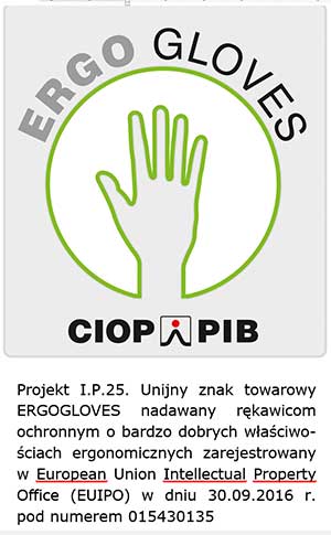 Opracowano graficzny znak towarowy dla rękawic ochronnych o dużej wygodzie użytkowania ERGOGLOVES, który został zastrzeżony prawnie na terenie Unii Europejskiej z okresem ochrony na 10 lat w 1 klasie (usługi ‒ w zakresie certyfikacji wyrobów na znak zgodności). Znak zarejestrowano w European Union Intellectual Property Office (EUIPO) w dniu 30.09.2016 r. pod numerem 015430135. Znak ten będzie nadawany przez CIOP-PIB rękawicom ochronnym o bardzo dobrych właściwościach ergonomicznych, które przejdą pozytywnie ocenę laboratoryjną z wykorzystaniem opracowanych kryteriów.