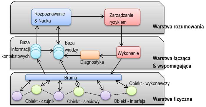 W ramach 2. etapu projektu przeprowadzono przegląd architektur systemów do inteligentnych środowisk, ze szczególnym uwzględnieniem inteligentnych domów oraz inteligentnej ochrony zdrowia, gdyż te obszary ukierunkowane są na zapewnienie bezpieczeństwa i komfortu oraz monitorowanie zdrowia człowieka. Przegląd aplikacji w tych obszarach wskazał na możliwość zastosowania podobnej metodologii do tworzenia inteligentnego środowiska pracy, gdyż aplikacje te charakteryzują się podobnymi celami, jak zarządzanie bezpieczeństwem i higieną pracy. Analizując strukturę warstwową tych architektur zauważono wiele podobieństw, a największe różnice są na poziomie warstwy fizycznej, obiektów fizycznych, które są dedykowane do konkretnej aplikacji, czyli środowiska, i mają określone z góry zadania do realizacji. Ponadto znaczące różnice w doborze komponentów występują w warstwie rozumowania, gdyż stosowane są oryginalne podejścia do sposobu „rozumienia” środowiska i podejmowania decyzji co do działań realizowanych w tym środowisku. Wykorzystując tę wiedzę opracowano model konceptualny architektury systemu monitorowania i zarządzania bezpieczeństwem i higieną pracy w inteligentnym środowisku pracy. Ogólna propozycja architektury tego systemu składa się z trzech warstw: fizycznej (ang. Physical layer), łączącej i wspomagającej (ang. Leaf-Spine layer) oraz rozumowania (ang. Reasoning layer). Określono komponenty występujące w warstwach modelu architektury systemu i przedstawiono rozwinięcie tego modelu i prezentację z perspektyw: urządzeń technicznych, komunikacji, interfejsu użytkownika oraz przy uwzględnieniu hierarchii środków kontroli.