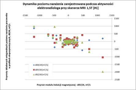 Charakterystykę zagrożeń przeanalizowano na podstawie badań ekspozymetrycznych, wykonanych podczas rutynowych prac związanych z diagnostycznym wykorzystaniem skanerów rezonansu magnetycznego 0,2–3T (gdzie występują najsilniejsze narażenia w środowisku pracy). Dla każdego profilu przeanalizowano takie parametry dynamiczne ruchów jednostkowych (tj. kiedy występuje monotoniczny przyrost indukcji magnetycznej), jak: dB – przyrost indukcji pola, dT – czas trwania, dynamika przyrostu indukcji w czasie – dB/dT. Analiza parametrów narażenia podczas 1100 ruchów jednostkowych wykazała, że: a) należy oceniać wektorowe parametry narażenia w profilach ekspozymetrycznych; b) wystarczająca jest analiza składowych narażeń o częstotliwości z pasma 0–5 Hz – węższego niż 0–25 Hz zalecane przez ICNIRP’2014; c) zalecane przez ICNIRP analizowanie dynamiki poziomu narażeń w okresach