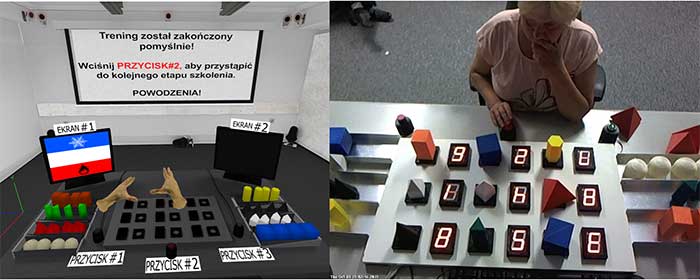 Środowisko wirtualne obserwowane przez osobę wyposażoną w gogle rzeczywistości wirtualnej typu HMD (ang. head mounted display) oraz symulator uproszczonego stanowiska pracy wykorzystywany do zebrania danych umożliwiających ocenę dwóch metod szkoleniowych ‒ pierwszej standardowej (w tym materiały multimedialne) i drugiej z wykorzystaniem techniki rzeczywistości wirtualnej; szkolenie dotyczyło procedury postępowania wymagającej dużych zasobów poznawczych