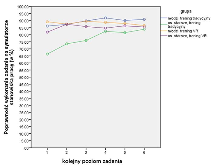 Analiza statystyczna dotyczyła przede wszystkim wychwycenia różnic we wpływie wirtualnego środowiska na samopoczucie osób starszych i młodszych oraz ilościowego określenia skuteczności aplikacji szkoleniowych wykorzystujących techniki rzeczywistości wirtualnej względem obecnie stosowanych metod szkoleniowych w zależności od wieku osoby szkolonej, na przykładzie dwóch grup wiekowych. Potwierdzono założenie, że w przypadku osób starszych szkolenie w środowisku wirtualnym powinno przynieść lepsze efekty ze względu na mniejsze obciążenie poznawcze wynikające z występowania w tym środowisku mniejszej liczby abstrakcyjnych pojęć w stosunku do typowych (obecnie wykorzystywanych) metod szkolenia. W szczególności jednoczynnikowa analiza wariancji wykazała istotne różnice w poprawności wykonania zadania przez grupy osób, które uczestniczyły w badaniu [F(10,998) = 3,97, p < 0,001]. Wynik testów statystycznych umożliwia stwierdzenie, iż grupa osób starszych różniła się istotnie pod względem poprawności wykonania zadania manualnego od wszystkich pozostałych grup. Grupa osób starszych, która uczestniczyła w treningu tradycyjnym, wykonywała zadanie manualne z mniejszą poprawnością niż pozostałe osoby. Grupa osób starszych, która uczestniczyła w treningu VR, nie różniła się istotnie pod względem poprawności wykonania zadania od obu grup osób młodych.