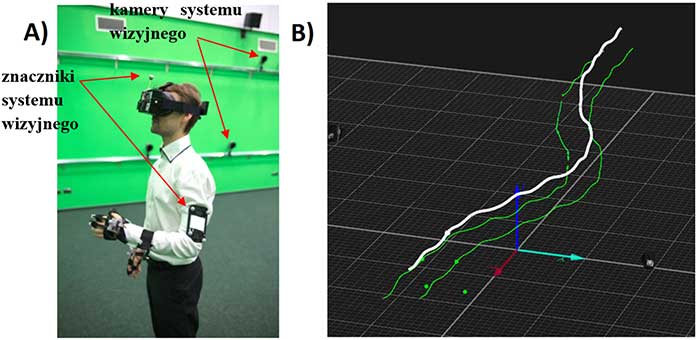 Zadanie 2.Z.16. A) Osoba przygotowana do wzięcia udziału w badaniach wyposażona w gogle i rękawice rzeczywistości wirtualnej. B) Przykładowa trajektoria ruchu punktów zarejestrowanych przez system wizyjny zainstalowany w Laboratorium Zanurzeniowej Rzeczywistości Wirtualnej; białym kolorem oznaczono punkt umieszczony na głowie