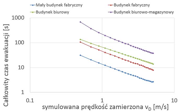 Opracowane oprogramowanie komputerowe dedykowane symulacji procesu ewakuacji ludzi z budynków przetestowano przez przeprowadzenie przykładowych obliczeń dla 4 różnych budynków: budynek biurowo-magazynowy, budynek biurowy, budynek fabryczny oraz mały budynek fabryczny. Dla każdego z tych budynków przygotowano rozbudowane środowisko wirtualne oraz wyznaczono całkowity czas ewakuacji w funkcji wartości parametru kontrolnego, jakim jest prędkość zamierzona vD. Dla wszystkich budynków zaobserwowano to samo prawo potęgowego skalowania całkowitego czasu ewakuacji w zależności od wartości prędkości zamierzonej.