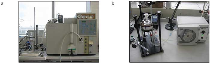 Zadanie 3.Z.19. Stanowiska do badania odporności materiałów na przenikanie zgodnie z wymaganiami w normie PN-EN 16523-1:2015-05: a) propan-2-olu, (celka przenikania - LABC.de; GC-FID – ATI Unicam 610 Series); b) 96% kwasu siarkowego (VI), (celka przenikania – Pracownia Szkła Technicznego; konduktometr typ CPC 401, Elmetrion)