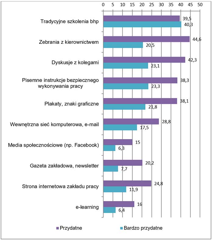 Z analizy wyników badań przeprowadzonych w dwóch pierwszych etapach projektu wynika, że zarówno kierownicy, jak i pracownicy znacznie wyżej oceniają przydatność klasycznych niż elektronicznych metod komunikowania się. Jednocześnie na metody elektroniczne jako przydatne do komunikowania się w sprawach BHP wskazują nieco częściej niż osoby zaliczanie do innych grup kobiety, osoby w wieku poniżej 35 lat, o krótszym stażu pracy (poniżej 1 roku oraz od 1 do 4 lat), wykształceniu wyższym, a także wykonujące pracę umysłową. Studia przypadku potwierdzają, że ocena przydatności metod elektronicznych zależy w dużym stopniu od rodzaju wykonywanej pracy i że są one na ogół łatwiej akceptowane przez pracowników biurowych mających bezpośredni dostęp do komputerów w pracy, a także przez pracowników należących do młodszych. Jednak chęć wykorzystywania takich metod deklarują również pracownicy ze starszych grup wieku, pod warunkiem ich odpowiedniego zaprojektowania i wdrożenia. Z pierwszego studium przypadku wynika także, że w zarządzaniu BHP metody elektroniczne, włączając w to portale społecznościowe, są użyteczne przede wszystkim w zakresie upowszechniania informacji i promowania określonych zagadnień, a także, w przypadku poczty elektronicznej, do przekazywania informacji o charakterze administracyjnym i nowości. Jak wykazuje studium przypadku w przedsiębiorstwie produkcyjnym, przy wykorzystywaniu metod elektronicznych w celu wewnętrznej wymiany informacji dotyczących BHP szczególną uwagę należy zwrócić na ich odpowiednie zaprojektowanie i wdrażanie (szkolenia, zachęty ze strony kierowników), gdyż skomplikowane systemy, których obsługa jest czasochłonna, nie są w praktyce wykorzystywane.