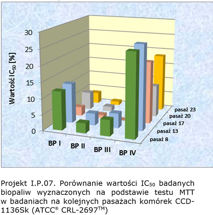 ‒ porównano cytotoksyczne działanie czterech biopaliw otrzymanych w procesie transestryfikacji tłuszczów, takich jak: przeterminowany olej rzepakowy (BP I), odpadowy tłuszcz zwierzęcy (BP II), roślinny olej posmażalniczy (BP III), oraz surowego oleju rzepakowego (BP IV) na kolejne pasaże komórek CCD-8Lu oraz CCD-1136Sk.