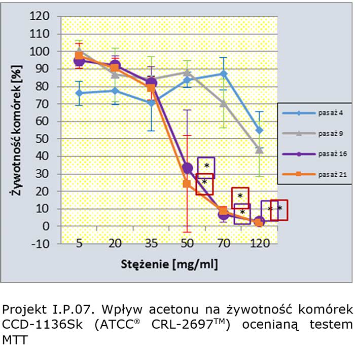 ‒ przeprowadzono ocenę cytotoksycznego działania sześciu rozpuszczalników organicznych (acetonu; 2-propanolu; 2-metoksyetanolu; 2-etoksyetanolu; 1,4--dioksanu oraz tetrahydrofuranu) na kolejnych pasażach starzejących się komórek wyprowadzonych z układu oddechowego i skóry człowieka