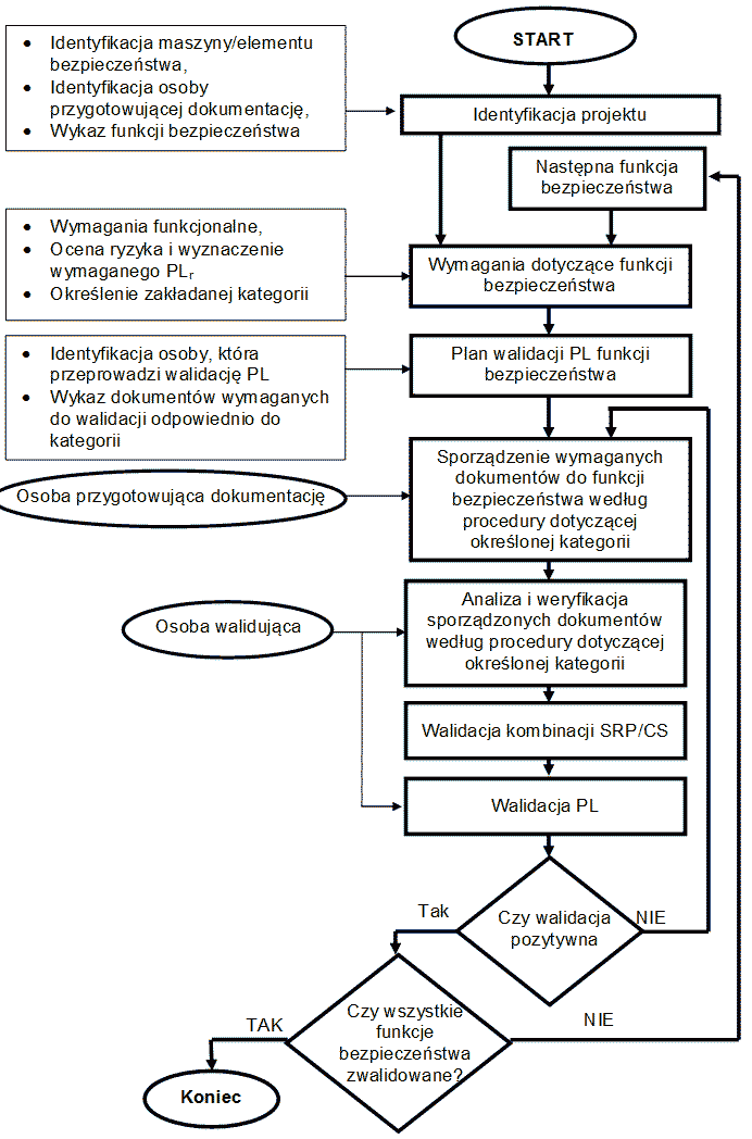 W ramach 1. etapu opracowano w formie graficznej procedury postępowania w procesie walidacji poziomu zapewnienia bezpieczeństwa przez systemy sterowania maszynami oraz wzory dokumentów potwierdzających osiągnięte parametry. Opracowane procedury i wzory dokumentów stanowiły podstawę do opracowania założeń do programu.