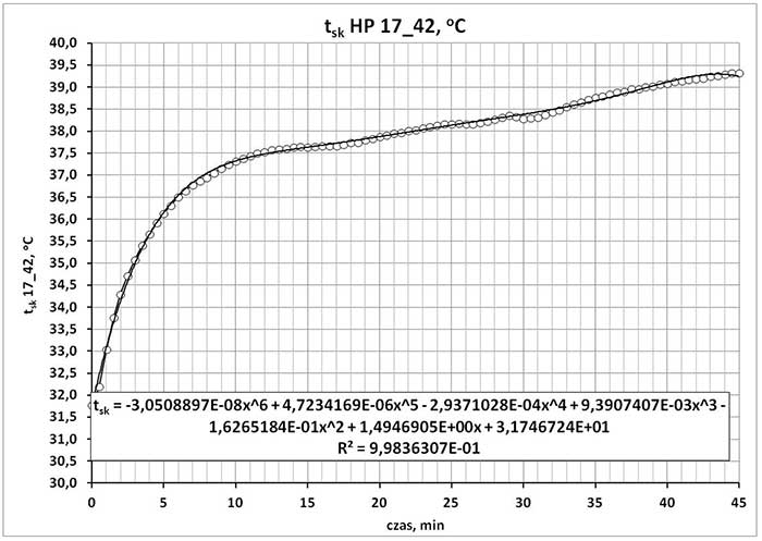 Zadanie 2.Z.22. Wielomian 6. stopnia opisujący zmienność w czasie średniej ważonej temperatury powierzchni skóry u uczestnika badań podczas jego pobytu w warunkach środowiska gorącego w temperaturze otoczenia 42 oC i wilgotności względnej 80%