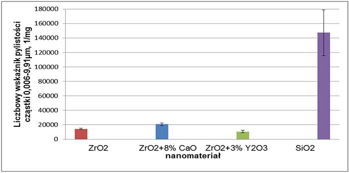 Na wartość wskaźnika masowego oraz wskaźników liczbowych widoczny wpływ może mieć nawet niewielka zmiana składu danego nanomateriału. Dodatek tlenku wapnia (8%) do tlenku cyrkonu spowodował 6-krotny wzrost masowego wskaźnika pylistości frakcji respirabilnej, 3,5-krotny wzrost liczbowego wskaźnika pylistości obliczonego na podstawie wyników P-TRAK i 1,5-krotny wzrost wskaźnika liczbowego uzyskanego na podstawie danych z ELPI+. Dodatek tlenku itru (3%) do tlenku cyrkonu spowodował natomiast obniżenie o 15% wskaźnika liczbowego pylistości uzyskanego z danych P-TRAK i 25-procentowy spadek wskaźnika liczbowego obliczonego z danych uzyskanych dzięki ELPI+.
