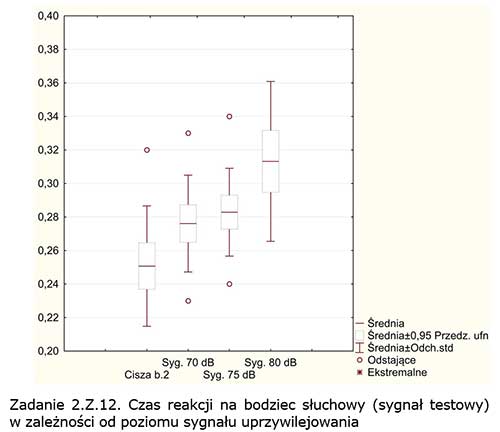 Badania sprawności psychofizycznych przeprowadzono w ciszy (tj. bez ekspozycji na sygnał uprzywilejowania) oraz w warunkach ekspozycji na sygnał uprzywilejowania o poziomach wynoszących 70, 75 i 80 dB.