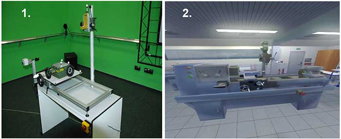 Projekt IV.P.03. Symulator wirtualnej kombinowanej maszyny (tokarko-frezarko-wiertarki) wyposażony w rzeczywisty (1) i wirtualny (2) pulpit sterowniczy