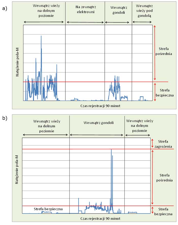 Zadanie 2.Z.29. Natężenia pola magnetycznego oddziałującego na pracującego w otoczeniu infrastruktury technicznej wewnątrz i na zewnątrz elektrowni wiatrowej z generatorami szybkoobrotowymi: a) o mocy 2,5 MW – przetworniki DC/AC i AC/AC oraz okablowanie zlokalizowane na dolnym poziomie wieży, b) o mocy 2,0 MW – wyposażenie elektroenergetyczne zlokalizowane w gondoli (na rysunku przedstawiono wyniki monitoringu narażenia podczas 90-minutowej typowej aktywności)