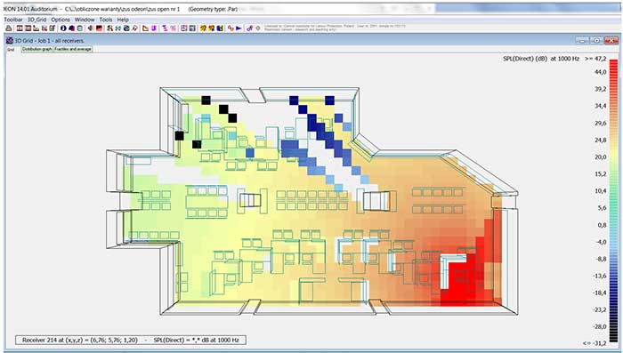 Projekt II.P.13. Mapa poziomu ciśnienia akustycznego w paśmie częstotliwości 1 kHz dźwięku bezpośrednio promieniowanego ze źródła mowy w pomieszczeniu open space nr 1
