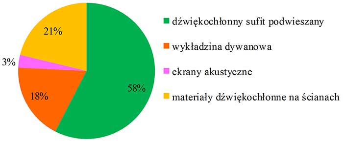 Na podstawie przeprowadzonych badań stwierdzono, że ze względu na właściwości fizyczne propagacji dźwięku oraz właściwości rozpatrywanych pomieszczeń, w niektórych typach pomieszczeń nie ma (poza wyjątkowymi przypadkami) dużych trudności w spełnieniu określonych kryteriów akustycznych (np. pomieszczenia biurowe małe). Natomiast w innych pomieszczeniach (sale lekcyjne i wykładowe oraz sale biurowe open space) uzyskanie zadanych kryteriów jest trudne lub prawie niemożliwe. Wymagają one największych modernizacji pod względem akustycznym, przy czym najbardziej efektywnym rozwiązaniem będzie zastosowanie w salach o objętości do 250 m3 dźwiękochłonnego sufitu podwieszanego o klasie pochłaniania dźwięku „A” oraz w przypadku nadal zbyt małej chłonności akustycznej, zastosowanie dodatkowego materiału dźwiękochłonnego na ścianach (szczególnie tylnej). Najtrudniejszymi pomieszczeniami pod względem wymagań akustycznych są pomieszczenia open space. W celu osiągnięcia wymaganych warunków akustycznych konieczne jest zastosowanie w nich dźwiękochłonnego sufitu podwieszanego o klasie pochłaniania dźwięku A, ekranów akustycznych o wysokości ok. 2 m, pokrytych materiałem dźwiękochłonnym o klasie pochłaniania dźwięku A lub B oraz wprowadzenia tzw. źródeł maskujących sygnał mowy o poziomie dźwięku A ok. 35-40 dB. Rozwiązania takie zweryfikowano metodą symulacji cyfrowej obiektu rzeczywistego programem komputerowym do symulacji pola akustycznego ODEON oraz przez fizyczne wykonanie adaptacji akustycznej w biurze open space oraz laboratorium.