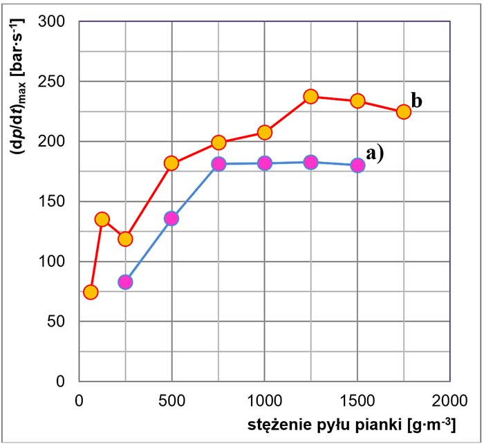 Zadanie 2.Z.03. Zmiany maksymalnej szybkości narastania ciśnienia wybuchu obłoków pyłu: a) sztywnej pianki poliuretanowej, b) sztywnej pianki poliuretanowej modyfikowanej nanorurkami węgla