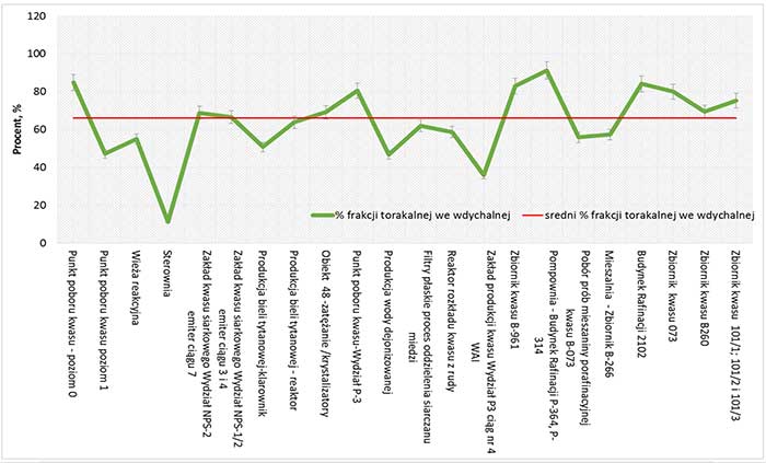Stężenie frakcji wdychalnej kwasu siarkowego pobieranej w tych samych punktach wynosiło odpowiednio przy punkcie pobierania prób mieszaniny zawierającej ok. 30% kwasu siarkowego (303 µg/m3), w zakładzie produkcji kwasu przy ciągu produkcyjnym 4 (288 µg/m3), przy zatężaniu na obiekcie 48 (106 µg/m3) i przy produkcji bieli tytanowej przy klarowniku (50 µg/m3). Przeprowadzone wstępne badania wykazały, że frakcja torakalna kwasu siarkowego stanowi od 11 do 91% frakcji wdychalnej w zależności od miejsca i procesu, co daję średnią zawartość frakcji torakalnej kwasu siarkowego(VI) we frakcji wdychalnej – 64%.