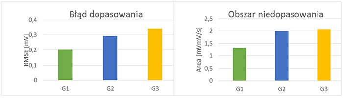 Projekt I.P.09. Rozkład wartości błędu dopasowania do wzorca, wartość obszaru (pola) między wzorcem a sygnałem EMG G2 ‒ grupa 40 ‒ 45 lat, G3 ‒ grupa 60 ‒ 65 lat