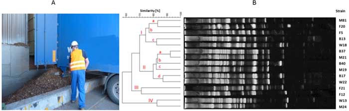 Projekt II.P.16: A – przykładowe stanowisko pracy: rozładunek biosurowców; B – przykładowy dendrogram podobieństwa genetycznego szczepów B. licheniformis (szczepy izolowano z: M – masek ochronnych, W – rąk pracowników, B – biosurowców)