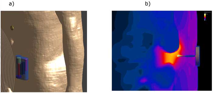 Projekt II.P.14. Widok modelu numerycznego scenariusza narażenia użytkownika pompy insulinowej przy aplikatorze do magnetoterapii (a) i rozkład natężenia indukowanego pola elektrycznego w modelu ciała użytkownika w otoczeniu igły podającej insulinę, wkłutej w brzuch (b)