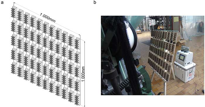 Projekt II.P.18. Prototyp ekranu włóknistego o konstrukcji ażurowej do eliminowania zanieczyszczeń w postaci aerozoli ze środowiska pracy: a) schemat, b) model
