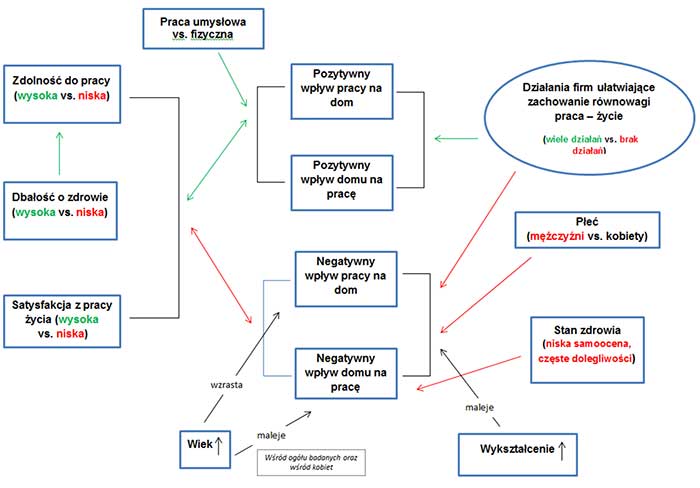 Projekt I.P.15. Model zależności pomiędzy pozytywną vs. negatywną interakcją praca-dom oraz wybranymi zmiennymi (kolor zielony – dodatni wpływ, kolor czerwony – ujemny wpływ)