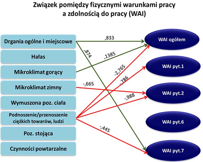 - na 8 branych pod uwagę fizycznych warunków pracy, w przypadku czterech odnotowano negatywny wpływ na zdolność do pracy ogólną lub niektóre jej aspekty. Dotyczyło to przede wszystkim podnoszenia/noszenia ciężarów oraz niskich temperatur.