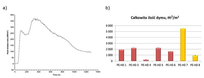 Projekt III.P.01. Przebieg przykładowej krzywej szybkości uwalniania ciepła (a) oraz wartości całkowitej emisji dymu dla oznaczonych na wykresie kolorem czerwonym kompozytów, a także materiałów referencyjnych, oznaczonych kolorem żółtym, w postaci polietylenu (PE-HD 8)) i polimeru zawierającego antypiren halogenowy (PE-HD 7) na bazie polietylenu wysokiej gęstości