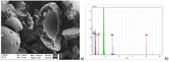 Zadanie 2.Z.04. Zdjęcie mikroskopowe (SEM) o powiększeniu 50.00KX (a) oraz skład chemiczny cząstek (EDS) pobranych z powietrza podczas procesu nasypywania do formy i wysypywania do torebki foliowej krzemionki modyfikowanej srebrem i suszonej rozpyłowo (Si, Ag, Cu, Na, C, O)