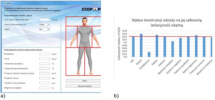 Projekt III.P.09. Program komputerowy do projektowania odzieży ciepłochronnej przeznaczonej do stosowania w określonym środowisku cieplnym: a) widok główny, b) przykład symulacji wpływu rozwiązań konstrukcyjnych zastosowanych w odzieży na jej izolacyjność cieplną
