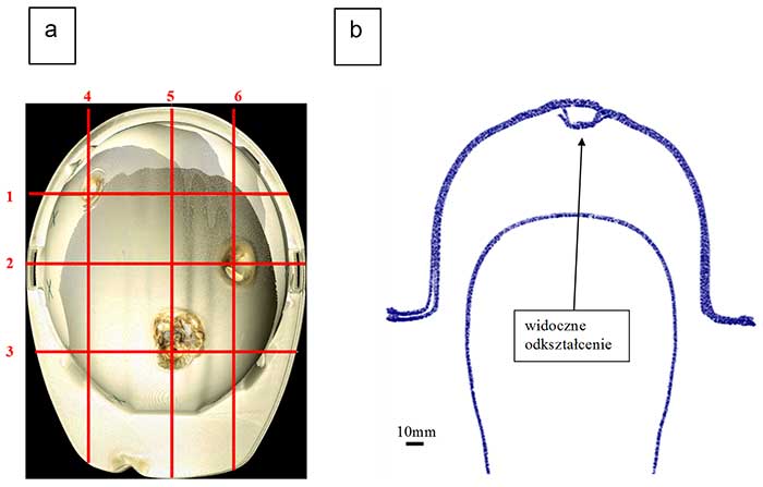 Zadanie 3.Z.14. Ocena odkształceń skorupy hełmu, a) widok odkształceń skorupy hełmu powstałych pod wpływem ciepła oraz oznaczone płaszczyzny pomiarowe, b) przekrój hełmu ochronnego w płaszczyźnie nr 2