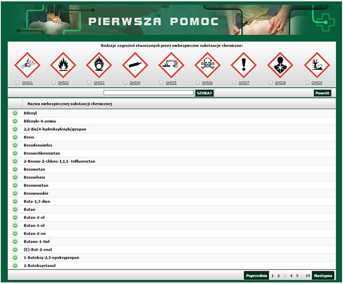 Opracowano i udostępniono w portalu Instytutu serwis informacyjny Pierwsza Pomoc wraz z aplikacją interaktywną prezentującą informacje dotyczące udzielenia pierwszej pomocy przy zatruciach chemicznymi substancjami niebezpiecznymi dla zatrucia inhalacyjnego, zatrucia drogą pokarmową, skażenia skóry oraz skażenia oczu. Aplikacja umożliwia użytkownikowi wyszukanie konkretnej substancji chemicznej wg zadanych kryteriów, np. wg rodzaju zagrożenia stwarzanego przez niebezpieczne substancje chemiczne.