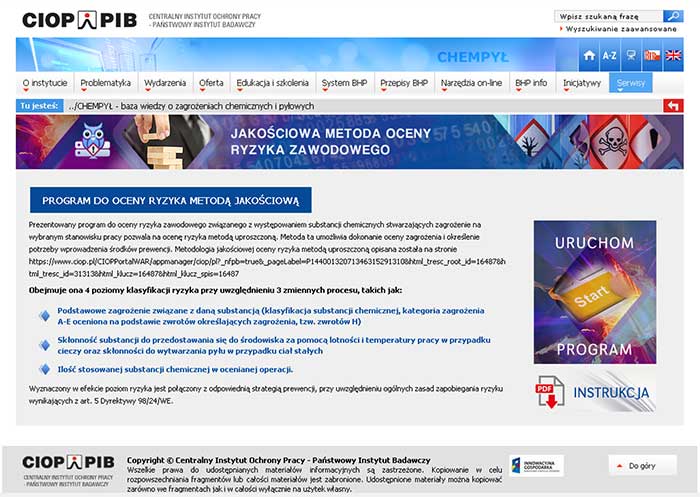 Bazą do powstania programu była jakościowa metoda oceny ryzyka zawodowego umożliwiająca dokonanie oceny zagrożenia związanego z występowaniem substancji chemicznej na stanowisku pracy i określenie potrzeby wprowadzenia środków prewencji (przygotowano założenia merytoryczne, opracowano aplikację w języku programowania JAVA w postaci portletu, który umieszczono na serwerze aplikacyjnym Instytutu Weblogic Portal, przygotowano projekty graficzne jej poszczególnych elementów i poddano testowaniu pod kątem poprawności implementacji poszczególnych funkcjonalności). Poprawioną wersję udostępniono użytkownikom serwisu we wrześniu 2016 r. Jednocześnie w każdym z etapów prowadzono prace związane z bieżącą aktualizacją danych wprowadzonych już do serwisu. Wprowadzono nowe działy, wspomniany już zbiór informacji nt substancji rakotwórczych i mutagennych, a także związany z nim dział nt. metod bezpomiarowych. W kolejnych etapach zadania weryfikowano wszystkie zgromadzone materiały pod kątem zmian w ustawodawstwie (Podstawy prawne, Aktualności, Definicje, Pyły, Ocena narażenia, Ocena ryzyka i Dobre praktyki). Wzbogacono również zbiór materiałów wspomagających przez umieszczenie ok. 20 plików pdf. z materiałami informacyjnymi oraz zaleceniami dotyczącymi zarządzania ryzykiem zawodowym związanym z narażeniem na substancje chemiczne i pyły.