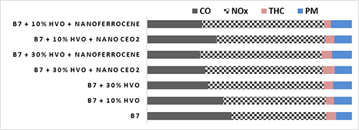 W przeprowadzonych badaniach wykorzystano silniki wysokoprężne bez systemów oczyszczania spalin zasilane olejem napędowym, a także jego mieszaniną z nanododatkiem na bazie ditlenku ceru. Badania wstępne prowadzono na przygotowanym w CIOP-PIB modelowym stanowisku, wyposażonym w silnik Diesla 2,0 TDI z Volkswagena, gdzie wykorzystano wielogazowe analizatory Dräger X-am 7000 wyposażone w odpowiednie czujniki do pomiarów stężeń tlenków azotu, tlenków węgla i węglowodorów. Emisję cząstek stałych określano za pomocą trzynastopoziomowego niskociśnieniowego impaktora kaskadowego ELPI. Druga część pomiarów przeprowadzona została na hamowni silnikowej z wykorzystaniem silnika badawczego o zapłonie samoczynnym XUD9. Stanowisko hamowni silnikowej zintegrowane było z systemem analizatorów spalin samochodowych do pomiaru stężenia CO, CO2, NOx i THC. Do wyznaczenia stężenia PM w spalinach zastosowano metodę korelacyjną badania cząstek stałych na podstawie badań zaciemnienia spalin. Wyniki przeprowadzonych pomiarów nie pozwoliły na ustalenie jednoznacznych zależności pomiędzy dodatkiem nanomodyfikatora a poziomem emisji szkodliwych dla zdrowia człowieka składników spalin. W związku z powyższym podjęto próby bardziej zaawansowanych badań emisji spalin na hamowni podwoziowej, jak również sprawdzono inne handlowo dostępne nanomodyfikatory paliw. Badania poszerzone zostały o sprawdzenie modyfikatorów ON zawierających nanocząstki ferrocenu oraz wybranego na potrzeby projektu biopaliwa, tj. hydrorafinowanego oleju roślinnego (HVO). Pomiary przeprowadzono z wykorzystaniem samochodu osobowego wyposażonego w silnik o zapłonie samoczynnym, spełniającego wymagania normy emisji spalin Euro 3 i zasilanego odpowiednią mieszanką oleju napędowego. Celem tych prac było odzwierciedlenie potencjalnych warunków drogowych i znalezienie rozwiązania pozwalającego na zmniejszenie emisji z tego typu silników wysokoprężnych. Uzyskane w testach NEDC, tj. nowym europejskim teście jezdnym, wyniki potwierdziły wpływ dodatków paliwowych na obniżanie emisji poszczególnych składników spalin silników diesla. Dodatki do paliwa B7, takie jak nanocząstki ferrocenu i ditlenku ceru, jak również paliwo ze źródeł odnawialnych, jakim jest HVO, i ich mieszaniny przygotowane na potrzeby projektu spowodowały znaczne obniżenie emisji CO i THC w stosunku do paliwa bazowego B7. Ustalono, że dodatek do oleju napędowego biopaliwa HVO wpływał na obniżenie emisji do powietrza stanowisk pracy tlenków węgla, węglowodorów i tlenków azotu. Na zmniejszenie emisji cząstek stałych (do 10% masy cząstek stałych i 7% liczby cząstek stałych) najlepszy wpływ miał dodatek nanocząstek ditlenku ceru do paliwa B7 (również z domieszką 10 i 30% HVO), natomiast na zmniejszenie emisji formaldehydu, a także tlenków azotu dodatek nanocząstek ferrocenu do paliwa B7 i 30% HVO.
