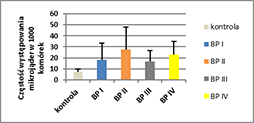 Wszystkie badane biopaliwa indukowały powstanie mikrojąder w komórkach jajnika chomika chińskiego CHO-9, natomiast nie indukowały powstania mikrojąder w komórkach nabłonka płuc pochodzenia nowotworowego A549. Częstość występowania mikrojąder w komórkach CHO-9 narażonych na badane biopaliwa nie różniła się między sobą, ale była istotnie większa od grupy kontrolnej (komórki nienarażone), co może wskazywać na potencjalne działanie genotoksyczne badanych biopaliw. Wszystkie badane biopaliwa indukowały, w zależności od stężenia, powstanie mikrojąder w komórkach jajnika chomika chińskiego CHO-9. Różnice w częstości występowania mikrojąder w komórkach A549 narażonych na badane biopaliwa w stosunku do kontroli nie były statystycznie istotne. Natomiast badane biopaliwa, oprócz biopaliwa II, w zależności od stężenia indukowały powstanie mikrojąder w komórkach nabłonka płuc pochodzenia nowotworowego A549.
