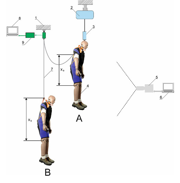 Zadanie 3.G.08.Badania zachowania szelek bezpieczeństwa podczas powstrzymywania spadania manekina antropomorficznego. Oznaczenia: 1 – sztywna konstrukcja nośna, 2 – żuraw, 3 – zaczep elektromagnetyczny, 4 – manekin antropomorficzny, 5 – szybka kamera cyfrowa, 6 – komputer, 7 – linka bezpieczeństwa, 8 – komputer z system akwizycji danych, 9 – przetwornik pomiarowy siły, filtr analogowy i wzmacniacz, A – pozycja manekina przed zrzutem, B – pozycja manekina po powstrzymaniu spadania z wysokości
