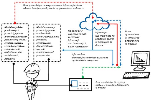 Zadanie 3.G.05. Schemat przykładu obiegu danych i informacji w systemie, w skład którego wchodzą czujniki zintegrowane ze środkami ochrony indywidualnej