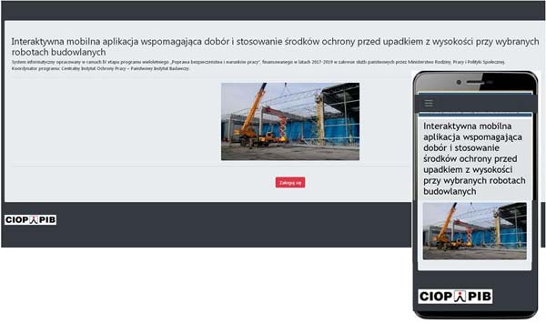 Rysunek 1. Interaktywna aplikacja mobilna wspomagająca dobór środków ochrony zbiorowej i indywidualnej w budownictwie - ekran powitalny dla użytkownika aplikacji (ekran komputera i telefonu komórkowego)